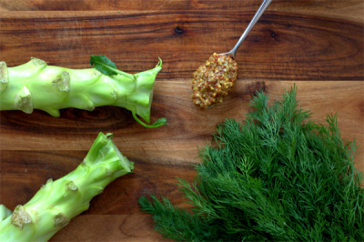 There are many more ways to enjoy the lesser-used parts of the broccoli plant than simply raw, and one of the tastiest and most versatile is a puree. I like to add a generous amount of mustard for acidity and heat, chopped dill for freshness, a glug of olive oil to give it a silkier texture, and just enough salt to make the flavors pop. The puree’s light green color and spicy kick make it reminiscent of wasabi, and for this reason it is perfect to serve as a bed for seared salmon. Lately, though, I’ve been using it as a dip for spring’s radishes and carrots, because you know what I like to accompany my vegetables – more vegetables!